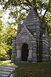 The cemetery contains the graves of many prominent pioneers to the West, as well as businessmen, politicians, and generals who remain significant figures in the history of St. Louis and the United States. The oldest graves in the cemetery are located on pioneer Edward Hempstead’s family lot and date as far back as 1816. Many of the wealthiest families at Bellefontaine are interred in ornate mausoleums which overlook the Mississippi River and draw from Classical, Romanesque, Gothic, and Egyptian architectural styles. Among the most notable mausoleums in the cemetery are: the Wainwright Tomb, designed for Charlotte Dickson Wainwright by the famed Chicago school architect Louis Sullivan in 1892; the Busch Mausoleum, designed for Adolphus Busch and Lilly Anheuser by Barnett, Haynes & Barnett in 1915; and the Brown Brothers Mausoleums, designed in 1910 by Isaac Taylor and in 1928 by Mauran, Russell and Crowell. There are also a number of large family plots in the cemetery, many of which are marked by tall obelisk monuments with elaborate bases. Guided tours of the cemetery’s main historical and architectural highlights are available and are open to the public. Alternatively, visitors can obtain self-guided tour brochures at the cemetery office.[4]