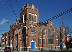 Belmont Methodist-Episcopal Church is a historic church building, located in the Belmont neighborhood of Roanoke, Virginia. It was built as a Methodist Episcopal church between 1917 and 1921, and is a three-story, brick, late Gothic Revival-style church. It features a tall bell tower, complex roof form, steeply-pitched gables and parapets, large pointed arch windows, crenellated corner towers, buttresses, cast-concrete quatrefoils, and other detailing.[3] Capacity within sight and hearing of the pulpit is 1,000, as the original auditorium (seats 440) was enlarged with an adjoining parlor (75), an adult assembly room (260), and a gallery (225).[4]