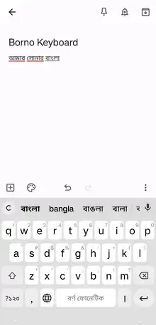 Borno (Bengali: বর্ণ) a 100% ad-free Bangla input method editor for Android,[24] maintained and developed by Jayed Ahsan; Codepotro.[25] The open-source version is licensed under GPL 3.0. while the regular version is available on Google Play Store. It has 9 different Bangla keyboard layouts including Borno Phonetic, which is a phonetic keyboard layout like Avro. It is still under development.[22]
