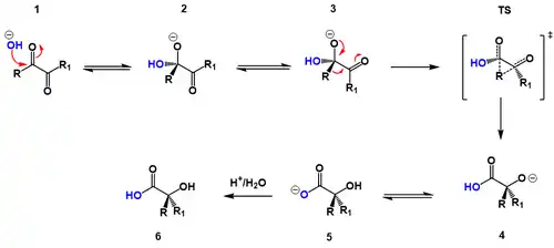 A hydroxide anion attacks one of the ketone groups in 1 in a nucleophilic addition to form the alkoxide 2. The next step requires a bond rotation to conformer 3 which places the migrating group R in position for attack on the second carbonyl group. In a concerted step, the migrating R group attacks the α-carbonyl group forming another alkoxide with concomitant formation of a keto-group at the other carbon. This migration step is rate-determining. This sequence resembles a nucleophilic acyl substitution. Calculations show that when R is methyl the charge build-up on this group in the transition state can be as high as 0.22, and that the methyl group is positioned between the central carbon–carbon bond.