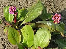 Bergenia crassifolia is a species of flowering plant of the genus Bergenia in the family Saxifragaceae. Common names for the species include heart-leaved bergenia,[1][2] heartleaf bergenia, leather bergenia,[2] winter-blooming bergenia,[3] elephant-ears,[1] elephant's ears,[2] Korean elephant-ear,[4] badan, pigsqueak,[3] Siberian tea,[2] and Mongolian tea.
