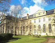 The abbey archives are lost and so the next period of the abbey's history is unclear. The monks certainly profited from their town's prosperity after it became a textile and financial centre in the 12th century. In 1249 a major fire destroyed part of the monastery, reducing it from 35 to 15 monks.[1] In the 15th century the abbey church's north nave aisle and apse were rebuilt in the Gothic style.[4] In 1563, Gaspard II de Coligny sacked the abbey and looted its treasures and archives and it was further damaged by the rural Gauthier uprising in 1589. It was then left almost deserted until 1618, when the cloister was rebuilt.[1] From 1628 it was taken on by the Mauristes, who began major building works in 1686. The refectory dates to 1694.[1] The works also demolished the church's two westernmost bays and two eastern apse chapels.[4] A new classical façade replaced the church's original one[7] and most of the capitals in the nave were plastered in stucco. The central tower was also heavily reworked.