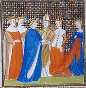 Bertha was, at the time, the lowest-ranking woman to marry a French king; no suitable princess could be found, since they were all too closely related to Philip for the marriage to any of them to be seen as perfectly valid by the Church. Bertha had no kings among her traceable ancestors and lacked even tenuous links with the Carolingian that her predecessors could claim. Consequently, contemporary chroniclers did not even try to present her lineage as more exalted than that of a count's daughter. Nevertheless, the shortage of royal candidates made Bertha a suitable choice.[5] The regal title she gained by this marriage was prestigious, but had little meaning, as she was confined to her husband's small royal domain that covered little more than areas around Paris and Orléans.[2]
