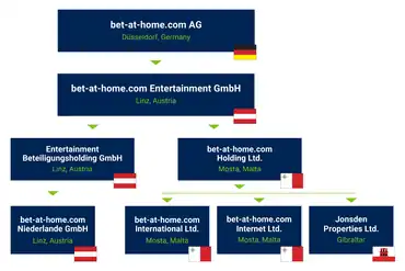bet-at-home.com AG is based in Düsseldorf and acts as the holding and is responsible for the listing of bet-at-home.com’s shares. The company holds 100% of bet-at-home.com Entertainment GmbH. The company’s Linz office is primarily responsible for the ongoing technology transfer within the company. The company’s international licences for online sports betting as well as its online gaming licences for casino and games are held by bet-at-home.com Holding Ltd. based in Mosta, Malta.