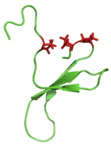 - ↑ Blanco, F. J.; Rivas, G.; Serrano, L. (1994). "A short linear peptide that folds into a native stable beta-hairpin in aqueous solution". Nat Struct Biol. 1 (9): 584–590. doi:10.1038/nsb0994-584. PMID 7634098. S2CID 35065527.