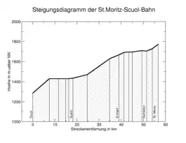The Bever–Scuol-Tarasp railway—also called the Engadinerbahn (Engadine Railway), Engadinerlinie (Engadine Line), Unterengadinerbahn (Lower Engadine Railway) or Unterengadinerlinie (Lower Engadine Line)—is a Swiss metre-gauge railway, which is operated by the Rhaetian Railway (Rhätischen Bahn; RhB) and connects the Lower Engadine with the Albula Railway. The Samedan–Pontresina railway is often also considered part of the line. Both lines are closely linked with each other. The Bever–Scuol-Tarasp railway is part of the RhB mainline network, so the kilometrage (chainage) has its zero point in Landquart.