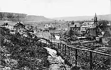 In the following year, a committee, to which representatives from Kaiserslautern, Waldfischbach and Schopp belonged, noted several advantages of such a route. It would benefit Pirmasens with its industry, the transport of timber in the areas of Johanniskreuz, Leimen, Lemberg, Merzalben, Ruppertsweiler, Trippstadt and Waldfischbach, the gravel pits in Heltersberg, Rodalben, Schmalenberg and Waldfischbach and the agriculture of the neighbouring Sickingen Heights and services for visitors to the waterfalls of the region.[4][5]
