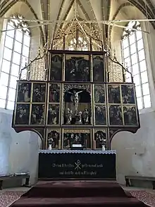 A hall church with three naves that retains a design close to the original,[1][2] it was the last such church built in Transylvania, and was constructed between 1486 and 1524[2] on the site of an earlier Romanesque church.[1][2] Dedicated to the Virgin Mary and built in Late Gothic style with Renaissance touches,[2][3][4] the structure was constrained by the hilly landscape. The choir is 18 m in length, with a rib-vaulted ceiling, while the three naves of equal height also have rib vaulting. A defensive level above the choir has parapets and a battlement.[2] A second, wooden, level was demolished in 1803.[1] The polyptych altarpiece has 28 panels executed between 1482 and 1513 by a painter likely trained at Vienna and Nuremberg. In the center, there is a sculpted group: a crucifix with Jesus Christ hanging, Mary standing and Mary Magdalene embracing the cross. The upper side panels show visions of Ezekiel and Augustus.[2] The stone pulpit, which shows scenes carved in relief, dates to 1523. The richly decorated intarsia door of the sacristy has a complex lock, displayed at the 1889 Paris World's Fair. Its central system blocks the door in thirteen points, ensuring the safety of the valuables kept in the sacristy.[1]