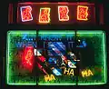 Didy Wah Didy is named for the last stop on a mythical railroad bound for hell (Black Southern American folklore.) With simple imagery and few words the piece is a timed neon sequence that shows a mushroom cloud forming (animated) over a boy's head. With the words "Atomic Playground Ahead" and "Kids Ride the Big One!" it is a piercing send-up of typical American roadside attractions. In three of the four corners, constantly flashing are the words "chills," "spills" and "thrills." When the "kid", who starts out smiling, then becomes alarmed, is finally "nuked," "death" with an alternating skull and crossbones flashes in the lower right hand corner. The three flashing words are surrounded by the icons common in Lawless' work, thunderbolts, dollar signs and stars. The display takes about 60 seconds to complete its sequence.