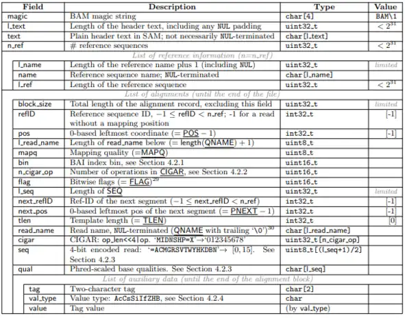 - 1 2 "Sequence Alignment/Map Format Specification" (PDF). The SAM/BAM Format Specification Working Group. 3 Jun 2021.