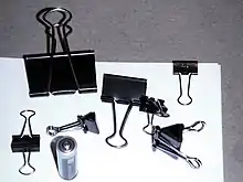 A binder clip, less commonly known as a paper clamp or foldover clip or bobby clip or clasp, is a simple device for binding sheets of paper together. It leaves the paper intact and can be removed quickly and easily, unlike the staple.