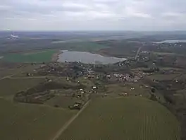 Aerial view of the Bindersee and the village of Rollsdorf from the northeast; on the right in the background is the "Sweet Lake"