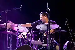 His next work on Birdman was in September, where he traveled to Los Angeles to re-record the soundtrack.[8] By this stage the film was assembled, so during the two days of recording Sánchez would watch a scene to see what Iñárritu had done with the demos, then redo the track.[15] This was a new experience for Sánchez who until this point, had guided his improvisations in response to "the sound and energy" around him. Here, he was using a scene to guide him, and said the biggest challenge of the soundtrack was "adapting what I do to a moving image, a story line, and dialogue."[16] As in New York, Iñárritu supervised these recordings, but this time would give specific directions. For example, instructing Sánchez to stop or start when Riggan uttered certain words.[11] Iñárritu also shaped the overall feel of the soundtrack. He wanted it to grow crazier throughout the film, so for the end tracks Sánchez would overdub up to four drum tracks on top of each other.[12][13] Additionally, Iñárritu was not satisfied with the quality of the sound from the previous recordings: it was too good. Instead, he wanted an instrument that sounded like it had not been played in years, to tie in with state of the theatre in the film.[11] To achieve this, Sánchez adjusted his setup; detuning the drums and stacking different kinds of cymbals on top of one another were among the techniques he used.[10][15] Amusingly, this process was included in the film  the first sound in Birdman is in fact Sánchez asking Iñárritu a question in Spanish, followed by his detuning of the drums.[10]