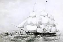 The sensation this created brought in competitors such as the Red Star Line, which also adopted fixed dates. The average passage of packets from New York to Liverpool was 23 days eastward and 40 days westward. But this was at a period where usual reported passages were 30 and 45 days respectively, while westward passages of 65 to 90 days excited no attention. The best passage from New York to Liverpool in those days was the 15 days 16 hours achieved at the end of 1823 by the ship New York (though often incorrectly reported as Canada).[4] The westward crossing had a remarkable record of 15 days 23 hours set by the Black Ball's Columbia in 1830,[5] during an unusually prolonged spell of easterly weather which saw several other packet ships making the journey in 16 to 17 days. Captain Joseph Delano was reported to be "up with the Banks of Newfoundland in ten days".[6][7]
