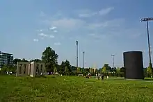 In 2016, the Minneapolis Sculpture Garden commenced a major renovation program designed to transform the current park into a more sustainable and "civic-minded" space, while simultaneously adding more works to diversify the representation of artists within the park. While the diversification focused on female artists in particular, Theaster Gates's previous work on renovation pieces in Chicago brought him to the Garden's attention as an artist exemplifying a "civic-minded" strategy.[2] Within a year, Gates was commissioned to construct Black Vessel for a Saint, completing construction of the exterior just in time for the Garden's reopening on June 10, 2017. As a deliberately meditative space, Black Vessel for a Saint was strategically placed near similar pieces like Kris Martin's Bell For Whom in order to cultivate an area of reflection and meditation. The piece's central component - a black statue of St. Laurence - was then inserted through the roof of the exterior vessel via a crane.