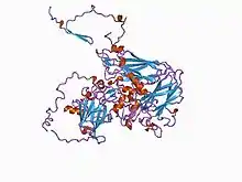 The black queen cell virus contains 60 copies of the capsid proteins VP1, VP2, and VP3.[6] The capsid is the shell of the virus that holds the virus's genetic material. VP4 proteins, which are sometimes also found in the capsid, do not affect the virus's infectivity,[6] or ability to be transmitted. The surface of the virion has large protrusions, which are formed by the VP1 and VP3 proteins and are located between the 5- and 3-fold axes of the icosahedral capsid.[6] An icosahedral capsid is formed from 20 triangular faces, put together in such a way that it resembles a sphere.[11] The axes are found where the faces come together.