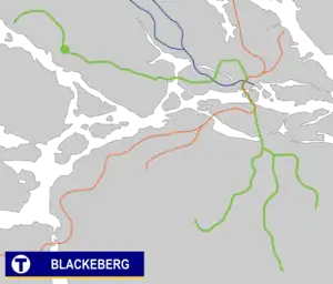 Blackeberg metro station is a station on the Green line of the Stockholm metro. It is located in the district of Blackeberg, which is part of the borough of Bromma in the west of the city of Stockholm.[3] The station has a single island platform, with access from a station building spanning the tracks. Two thirds of the platform is located outdoors and one third is located in a rock tunnel under Blackebergsplan.[4][5] The distance to Slussen is 14.1 km (8.8 mi).[1]