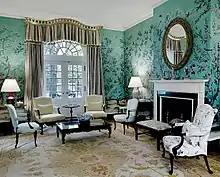The Dillon Drawing Room, which was originally known as the Lee Drawing Room, was renamed in honor of former U.S. secretary of the treasury C. Douglas Dillon, who donated its unique wallpaper, a Chinese print from 1770. Dillon's wife Phyllis purchased the wallpaper on the recommendation of interior designer Eleanor Brown in 1964.[30] The wallpaper was removed and refurbished between 1982 and 1988. The room is furnished with 18th-century English pieces, along with Chinese vases from the Ming and Qing (Kangxi reign) dynasties.[30] The Dillon Drawing Room is used by resident heads-of-state and chiefs of government to formally receive visitors.[16]