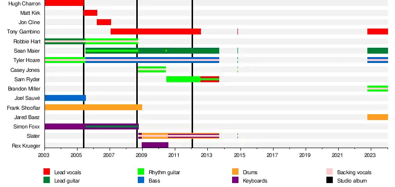 The band endured many line-up changes throughout its existence, leaving Hoare as the only original member. In July 2012, Tony Gambino announced he was stepping down as lead vocalist with Sam Ryder taking his place.[3]