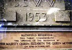 Some 800 acres (324 hectares) of reservoir was formed on land sold by Baron Bagot to the South Staffordshire Water Works (SSWW) in the 1940s. Blithfield Reservoir was opened by Queen Elizabeth, The Queen Mother on Tuesday 27 October 1953.[1]