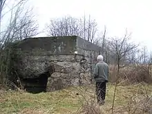 Before construction began in Blizna, there was nothing there but uncleared forest.[5] The Nazis used slave labour from the nearby SS Truppenübungsplatz Heidelager concentration camp in Pustków to build new infrastructure, starting with concrete roads, then a narrow-gauge railway line linking to the station at Kochanówka village.[5][8][13][14] They built barracks, bunkers, buildings and all the specialised equipment needed for the operation and firing of rockets.[5][8][15] In addition, efforts were made to disguise the site as much as possible. They did this by building an artificial village; cottages and barns were made of plywood, lines were hung with clothes and bed-sheets, and imitation people and animals were created using gypsum plaster.[8][15][9][10]