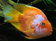 The blood parrot cichlid (Amphilophus citrinellus × Vieja melanurus), or parrot cichlid, is a hybrid species of fish in the family Cichlidae.[1] The fish was first bred in Taiwan around 1986.[2][3] Blood parrots should not be confused with other parrot cichlids or salt water parrotfish (family Scaridae).[4] Natural colors of the fish are red, yellow, and grey: other colors are injected by breeders.