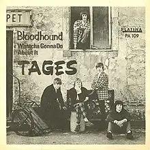 "Bloodhound" was initially released on November 3, 1965 as part of Tages eponymous debut album, where it was sequenced as the opening track.[12] However, as Tages had not had a single in the charts for almost two months by then, along with an ambition to capitalize on the Christmas sales rush, Platina Records issued "Bloodhound" as a single in 3,000 copies on November 19, 1965, only a few weeks after it had been released on the album.[13] The B-side was a cover of the Small Faces song "Whatcha Gonna Do About It", which had been recorded but left as an outtake during the same sessions as "Bloodhound".[11] Retrospectively, it was revealed that the single had been unauthorized by the band; Larsson jokingly stated during an interview in the year 2000 that the song had only been released as a single in order for "the record label manager [Evert Jakobsson] to afford a new car".[9]