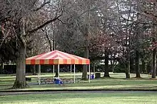 Amenities include public restrooms, wheelchair accessibility for most areas, trails, parking, sheltered picnic areas and tables, interpretive signs, and concessions.[11] Activities at the park include hiking, biking, cross country running, swimming, boating, fishing, wildlife viewing, volleyball, basketball, disc golf,[12] archery, and softball.[11] The park has a water-spray playground of about 3,500 square feet (330 m2) that uses municipal well water that is treated and recycled at the park.[13] Sculptures at the west end of the lake commemorate former Chinook villages along the Columbia River.[2] For a fee, Metro offers the use of a 2,080-square-foot (193 m2) structure called The Lake House for banquets, conferences, receptions, recitals, and weddings.[14] The Oregon Department of Fish and Wildlife stocks Blue Lake annually with trout.[2]