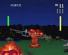 The player can choose from seven fighter planes instead of being settled with only one plane as in the original game, each one having their own advantages and disadvantages, but the player must complete the training missions first before gaining access to the other aircraft.[1][2][5][6] During gameplay, the player's plane can fire its machine gun or a limited number of missiles to use against enemy units.[1][2][6] In ground missions, the player is given access to three types of bombs.[1][3][4] The player can toggle between third-person and first-person views, perform an aleron roll to minimize damage from enemy fire, and activate the plane's afterburner for a short speed boost.[1][3][4][5] The planes also act as lives, and the game is over if all of them are crashed or destroyed, though extra planes can be obtained by either completing the chosen set of missions or reaching a certain score.[1][7]