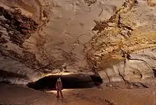 Blue Spring Cave is one of several Tennessee caves where footprints of Ice Age (Pleistocene) jaguars (Panthera onca augusta) have been discovered. It weighed an estimated 450 to 500 pounds, compared to the modern jaguar which weighs only 200 to 225 pounds. The footprints in Blue Spring cave were first noticed by Bill Walter in 1990, but he did not realize how old they were. Additional jaguar footprints were discovered by Hal Love on November 15, 2003, and, based on this discovery, their age and significance were recognized. These tracks are not close to any existing entrance, and it is surmised that the animal entered through a nearby entrance that has since collapsed.[3]