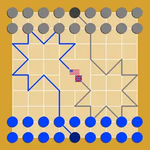 Blue and Gray is a strategy board game for two players invented by Henry Busch and Arthur Jaeger in 1903.[1] They obtained a patent for the game, but may never have published it. The name Blue and Gray "refers to the uniforms of the South and the North in the Civil War and in the original game the playing pieces of the contestants were of those colors."[1] Blue and Gray is a variant of checkers.[lower-alpha 1]