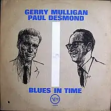 Gerry Mulligan - Paul Desmond Quartet (later retitled Blues in Time) is a jazz album by Paul Desmond and Gerry Mulligan released in 1957 on the Verve label.[6][7] The idea for this album was born in 1954, then postponed till summer of 1957 when Desmond suggested to record some pieces together. Producer Norman Granz managed to set up the recording date for the first session in August.[8] Blues in Time was also reissued on Verve V 8478 with a different cover (see below). The album is the first of two albums Mulligan and Desmond recorded in a pianoless quartet setting. The second, recorded in 1962, was Two of a Mind.