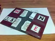 - The North player positions the board in the centre of the table (perhaps at the top of a stack of boards), making sure that it is correctly oriented so that each player's cards are nearest to him.