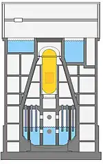 • the Mark III containment, generally similar in external shape to the stereotypical PWR, and with some similarities on the inside, at least on a superficial level. For example, rather than having a slab of concrete that staff could walk upon while the reactor was not being refueled covering the top of the primary containment and the RPV directly underneath, the Mark III takes the BWR in a more PWR-like direction by placing a water pool over this slab. Additional changes include abstracting the wetwell into a pressure-suppression pool with a weir wall separating it from the drywell.