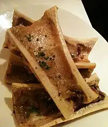 Beef bone marrow is also a main ingredient in the Italian dish ossobuco (braised veal shanks); the shanks are cross-cut and served bone-in, with the marrow still inside the bone. Beef marrow bones are often included in the French pot-au-feu broth, the cooked marrow being traditionally eaten on toasted bread with sprinkled coarse sea salt.[6]