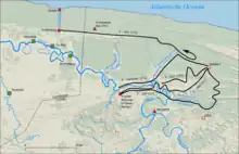 Boni and his warriors operated from a large fortress with a four-meter-high wall, which they called Fort Boekoe. It was located in the wetlands of the coastal region of Commewijne,[9] and named after the Boekoe Creek.[10] The wetlands provided strategic defences, and they armed the garrison with rifles and a cannon.[1]