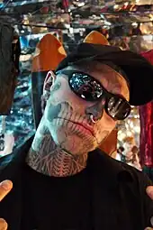 The video features full-bodied tattooed model Rick Genest (Rico), better known by his stage name Zombie Boy.[96] Gaga painted her face in a similar way to Genest, in one of the main series of sequences. She said that the sequences displayed the fact that she would not allow society or critics to dictate her sense of beauty. "I tell you what I think is beauty, and hence the scene was of me and Rico defining ourselves in artistic way and not relying on society to dictate it," she added.[97] The costumes for the video were designed by Formichetti, who blogged about the various designer pieces shown in it. In the opening sequence of the video, Gaga wore a head accessory by Alexis Bittar, a diamond neckpiece by Erickson Beamon with earrings by Pamela Love, and a stained-glass dress by Petra Storrs. Finger rings were provided by Erickson Beamon and chiffon clothes by Thierry Mugler. For the skeletons sequences, both she and Rico wore tuxedos by Mugler while the slime during the orgy scenes were courtesy of Bart Hess. For her Michael Jackson impression in the alley at the video's end, Gaga wore shirt and pants designed by her creative team, the Haus of Gaga, shoes by Natacha Marro, a Billykirk belt and LaCrasia gloves.[98]