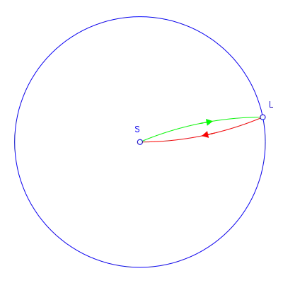 Notice that to send a laser pulse toward the stationary observer S at R = 0, the Langevin observer L has to aim slightly behind to correct for its own motion. Turning things around, just as a duck hunter would expect, to send a laser pulse toward the Langevin observer riding a counterclockwise rotating ring, the central observer has to aim, not at this observer's current position, but at the position at which he will arrive just in time to intercept the signal. These families of inward and outward bound radial null geodesics represent very different curves in spacetime and their projections do not agree for ω > 0.