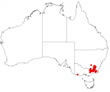 This bossiaea is found in north-eastern and far eastern Victoria, far south-eastern New South Wales, and in the Australian Capital Territory, growing in alpine and subalpine areas at altitudes above 800 m (2,600 ft), growing in heath and woodland (often bordered by grassland).[3][5]