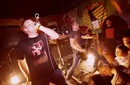 Despite Botch's level of acclaim after their demise, the group was initially poorly received by the local Washington hardcore scene. For the majority of their existence, "the band found themselves shunned by cliques and crews."[69] Latona described the negative reaction as "disheartening," and that Botch thought the group, "had something cool to share with people, and they were total assholes to us."[81] In the late 1990s, the group's complex music wasn't seen as very accessible, and their constant "poking fun at the scene" wasn't warmly received by their peers.[69] In addition to playing complex music, Botch actively avoided common hardcore stereotypes. Before walking on stage, Botch warmed up the crowd with pop music instead of heavier music.[8] Botch sold a t-shirt that featured two shirtless homosexual males sitting close on a couch with the words "Botch: The Best Boy Band Ever" written directly below. Cook designed the shirt by tracing an image out of a homosexual pornographic magazine and "drew a beer bottle over the cock," which was meant to be a "rebellion against all the typical skull and switchblade imagery" that is prevalent in the hardcore scene.[8] Botch wrote songs such as "C. Thomas Howell as the 'Soul Man'" which openly mocked straight-edge bands like Racetraitor and other bands with "lofty political ideals."[69] Botch also cited living in Tacoma, Washington and being isolated from Seattle as another reason for not being accepted into any regional music scenes.[9][82] In a 2011 interview with Rock Sound, Dave Verellen said "A lot of Seattle didn't like us, so we just did what we did," and that when We Are the Romans was released, "people were like, 'Yeah, it's good...' but like anything in that genre at the time it was a slow-starter because it wasn't exactly palatable. Hydra Head was stoked on it and, slowly, we started to get more press and play bigger shows. But even this week I've talked to more people about that record than I have since it came out."[69]
