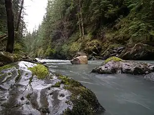 The river flows northwest from there and just as it is turning northeast it tumbles over very bouldery Boulder Falls. The river also flows over one more waterfall, Half Mile Falls, before the river makes its final push toward its confluence with the North Fork Stillaguamish River.[3]