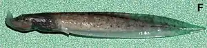 Tadpoles have a maximum length of about 33 mm (1.3 in). Body is slender and horizontally compressed, with dorsal fin than is slightly higher than the body. Oral disk is terminal with expanded and upward-directed lips.[3]