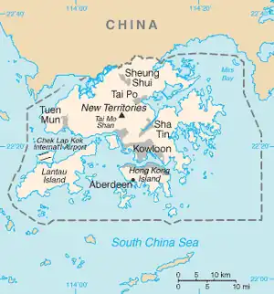 The Boundaries of Hong Kong, officially the Boundary of the Administrative Division of the Hong Kong Special Administrative Region of the People's Republic of China[1][2] (simplified Chinese: 中华人民共和国香港特别行政区行政区域界线; traditional Chinese: 中華人民共和國香港特別行政區行政區域界綫), is a regulated administrative border with border control in force under the One country, two systems constitutional principle, which separates the Hong Kong Special Administrative Region from mainland China, by land border fence of 30 km (19 mi) and maritime boundary of 733 km (455 mi),[1] enforcing a separate immigration and customs-controlled jurisdiction from mainland China.