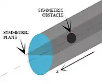 In this boundary condition, it is assumed that on the two sides of the boundary, same physical processes exist.[4] All the variables have same value and gradients at the same distance from the boundary. It acts as a mirror that reflects all the flow distribution to the other side.[5] The conditions at symmetric boundary are no flow across boundary and no scalar flux across boundary.