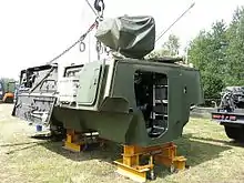 The mission module contains the mission-specific elements, such as weapons, equipment or crew. It is a key (and unique) feature of the Boxer. Mission modules are interchangeable pod-like units that are fitted to drive modules to form a complete mission variant vehicle. Mission modules are attached by four points and can be swapped within an hour under field conditions. The driver can access their compartment through the mission module or in an emergency via the large single-piece power-operated hatch above this position.[14]
