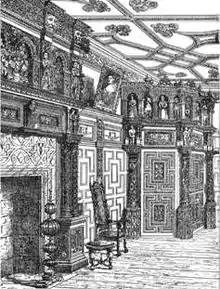 The house contains several remarkable features. The Great Hall with an early 16th-century hammerbeam roof, one of the most ornate in Devon, comparable to those at Weare Giffard Hall and Orleigh Court. It was repaired in 1860. On the wall is linen-fold paneling and a frieze of Renaissance-period heads within square panels. Several heraldic shields of members of the Walrond family impaled with the armorials of their wives are painted on the walls. The Music Room, as it was called by the Walrond family in 1910,[3] Parlour or "Spanish Room"[4] contains a highly decorated plasterwork ceiling with ribs and pendants and exceptionally elaborately carved woodwork. Above the paneling is a frieze of Spanish leather.