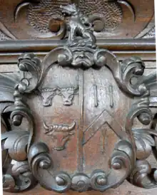 - Col. Henry Walrond (died 1724) (brother), who succeeded his elder brother Sir William Waldron (1639–1689). He trained as a lawyer and was admitted to the Inner Temple in 1662.[26] He was the owner of Bradfield House when William of Orange landed at Torbay on 6 November 1688. One of the Prince's generals used the house for his headquarters as is evidenced by a report written in Dutch addressed to unknown persons: "We have taken up our quarters in the house of Col. Hendric Waldron which quarters we desire shall be kept open as long as the troops of his highness shall remain in this town or neighbourhood. We have also left in the care of the aforesaid Col. Hendric Waldron two black horses and one grey mare which shall be kept for us. Signed by Sir Van Ginkel, Lt-General of the cavalry of the United Netherlands, in the service of his highness William Prince of Orange".[27] He married twice, firstly in 1698 to Elizabeth Strode, a daughter by his 1st wife of Sir William Strode (1614–1676), MP, of Newnham, Plympton St Mary and widow of Joseph (or Capt. Francis[28])Maynard of Tavistock, only surviving son of Sir John Maynard.[29] He married secondly Elizabeth Floyer (died 1749), daughter of William Floyer of Floyer Hayes in the parish of St Thomas, Exeter, and widow of James Holway of Uffculme.[30] The marriage was without children. The Floyer armorials are Sable, a chevron between three arrows argent and can be seen impaled with Walrond sculpted on the wooded pulpit in Uffculme Church, and on the chest-tomb presumed to be of his father William Walrond (died 1667/9).