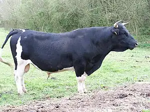 The Bretonne Pie Noir is breed of small dairy cattle from Brittany in north-western France. It originates from Cornouaille and the Pays de Vannes in the départements of Finistère and Morbihan. Due to its small size, modest requirements, good productivity and ability to exploit poor and marginal terrain, it was well suited to traditional Breton agriculture.[3] A herdbook was established in 1886.[4][5] The breed was in the past numerous; at the beginning of the twentieth century there were about 500,000. Numbers fell drastically during that century, and in 1976, when about 15,000 remained, a breed conservation plan was begun, the first such for any breed of cattle.[3]