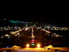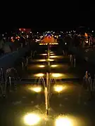 The Brindavan Gardens is a garden located 12 k.ms from the city of Mysore[1] in the Mandya District of the Indian State of Karnataka. It lies adjoining the Krishnarajasagara Dam which is built across the river Kaveri.[2] The work on laying out this garden was started in the year 1927 and completed in 1932.[3][4] Visited by close to 2 million tourists per year, the garden is one of the major attractions of Srirangapatna.[5] Sir Mirza Ismail, the Deewan of Mysore, a man with a penchant for gardens, founded the Brindavan Gardens (Krishnaraja Sagar Dam in particular) and built the Cauvery River high-level canal to irrigate 120,000 acres (490 km2) in modern Mandya district. The gardens were designed by German botanist and landscape designer Gustav Hermann Krumbiegel.