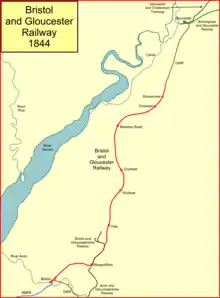 The Bristol and Gloucester Railway was a railway company opened in 1844 to run services between Bristol and Gloucester. It was built on the 7 ft (2,134 mm) Brunel gauge, but it was acquired in 1845 by the 4 ft 8+12 in (1,435 mm) standard gauge Midland Railway, which also acquired the Birmingham and Gloucester Railway at the same time.